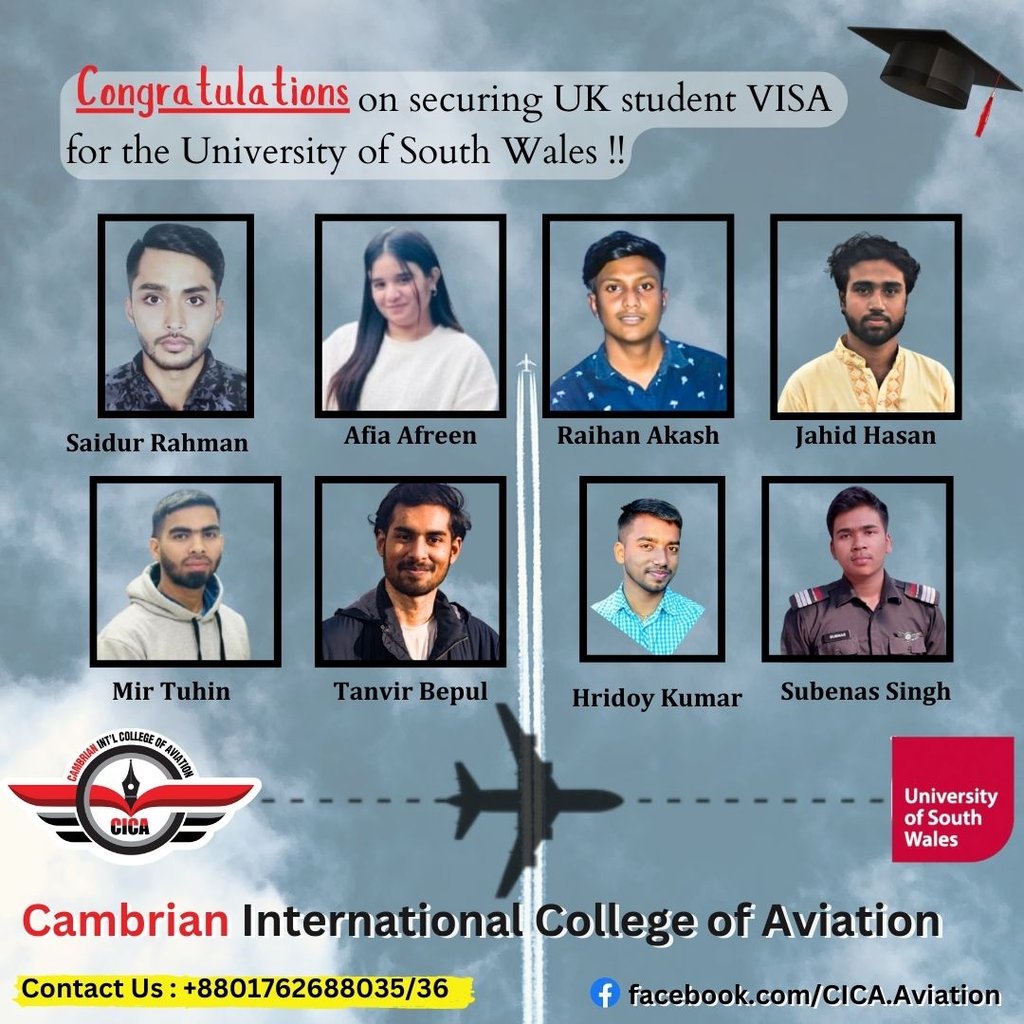 ক্যামব্রিয়ান ইন্টারন্যাশনাল কলেজ অব এভিয়েশনের (সাইকা) কৃতি শিক্ষার্থী আহসান হাবিব রনি এবং মুহাইমিনুল হায়াত খান সুপ্ত। তারা এই দুইজন সাইকার Higher National Diploma in Aeronautical Engineering (HND ) চতুর্থ ব্যাচের শিক্ষার্থী যারা 2022 সালে তাদের HND সম্পন্ন করে এবং Top- Up Education (Final Year ) ডিগ্রির জন্য লন্ডনের Staffordshire University তে লেখাপড়ার উদ্দেশ্যে পাড়ি জমায়। মাত্র ১ বছরেই গ্রাজুয়েশন কোর্স সম্পন্ন করার পরে আহসান হাবিব রনি BRITISH AIRWAYS এ চাকুরীর সুযোগ পায় এবং বর্তমানে সে BRITISH AIRWAYS এর Production Operative Assistant হিসেবে ফুল টাইম ভিত্তিতে কর্মরত রয়েছে। ক্যামব্রিয়ান পরিবার তাদের এই সাফল্যকে অভিনন্দন জানায়।