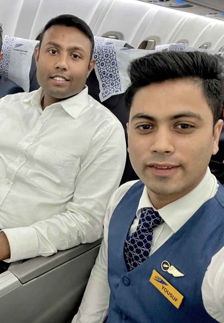 While returning back to DHAKA, I was delighted to see one of my student from Cambrian Int'l College of Aviation - CICA named YOUSUF MAHMUD, serving me during the CRUISE Flight. I am really amazed with his respectful behaviour and hardest effort on snatching my small bag from me. His professionalism and devotedness to his duty was noteworthy. Wishing him all the best in his future endeavors.